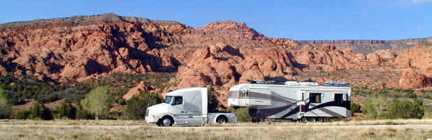 Our 2001 Royals International with our 1999 Volvo 610, boondocking in Moab, UT