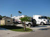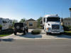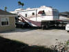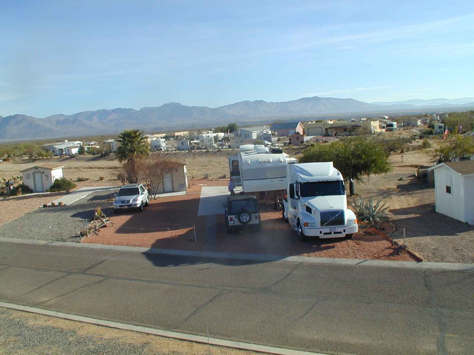 In January of 2006 we bought an RV lot in the Escapees North Ranch RV Park in Congress, Arizona. This is a deeded lot, 55'x75', with an L-shaped concrete pad that wraps around the fifth wheel. We have a 12'x12' shed with a washer (no dryer required - this is the desert) and utility cabinets. The lot is "zeroscaped" with stone, so there is virtually no maintenance.