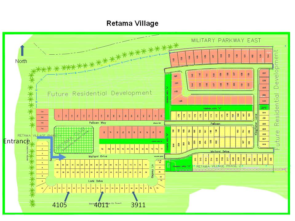 Retama Village is a brand new upscale 55+ adult community. It is oriented towards the active adult RVer. Eighty-nine deeded RV super-sites and compact single-family homes make up Phase I of the gated and walled community. Lush landscaping, a spectacular community center and pools complete the package. Restrictive covenants ensure the quality of the Village: there are no park models, permanent RV's, skirted RV's, RV's with rooms built off them, or un-approved "sheds".