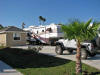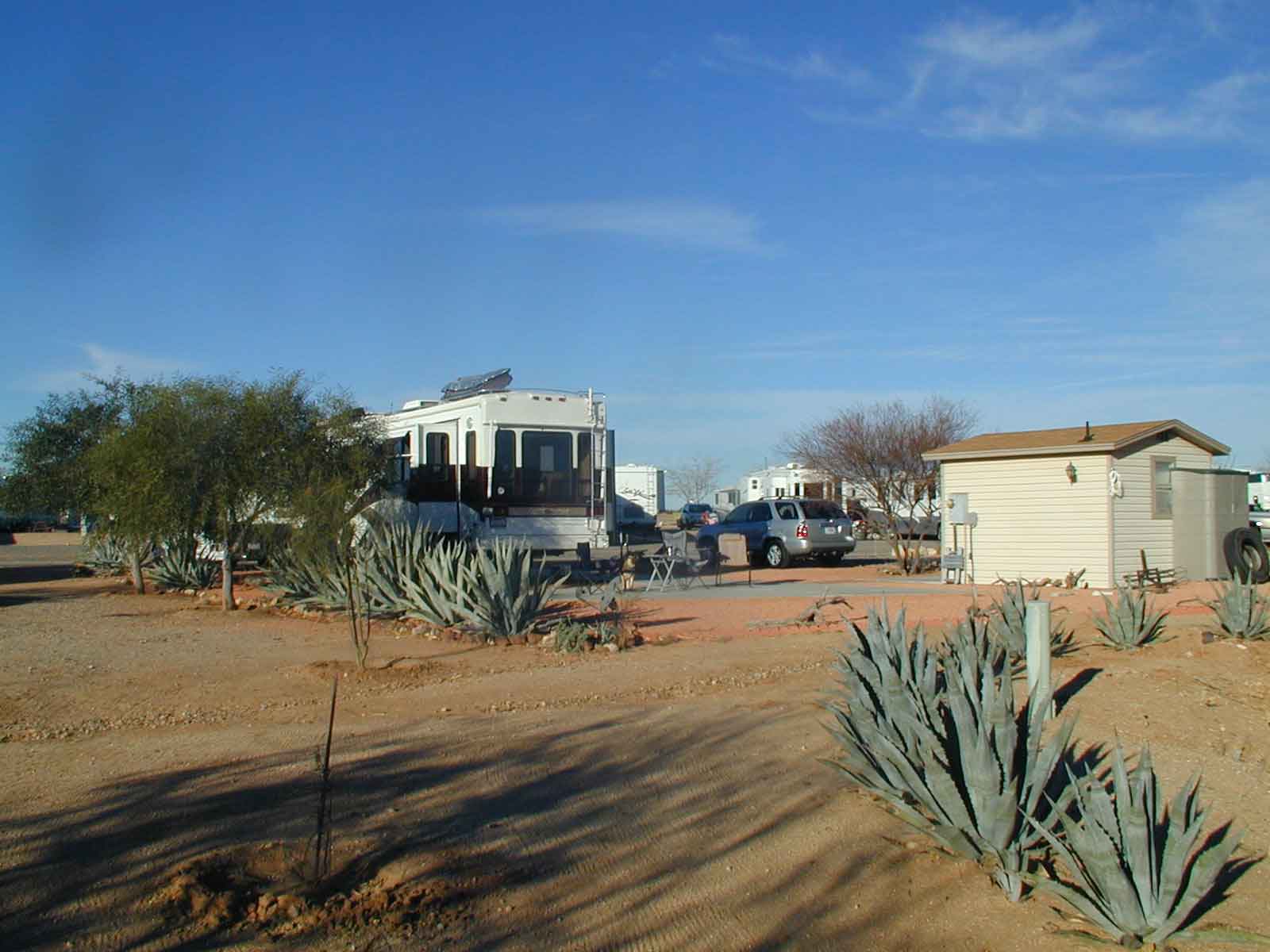 In January of 2006 we bought an RV lot in the Escapees North Ranch RV Park in Congress, Arizona. This is a deeded lot, 55'x75', with an L-shaped concrete pad that wraps around the fifth wheel. We have a 12'x12' shed with a washer (no dryer required - this is the desert) and utility cabinets. The lot is "zeroscaped" with stone, so there is virtually no maintenance.